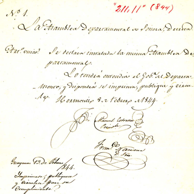 Decreto de 1844 sobre la instalación de la Asamblea Departamental.